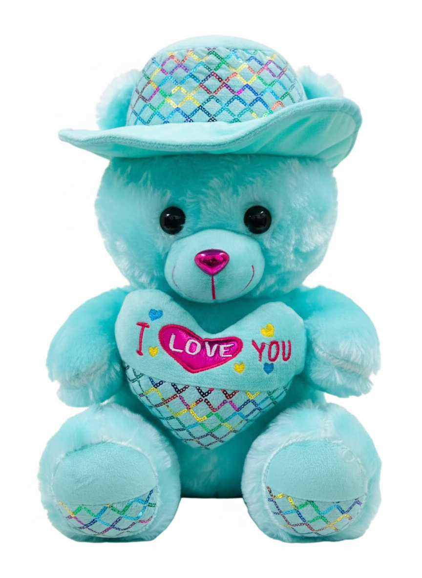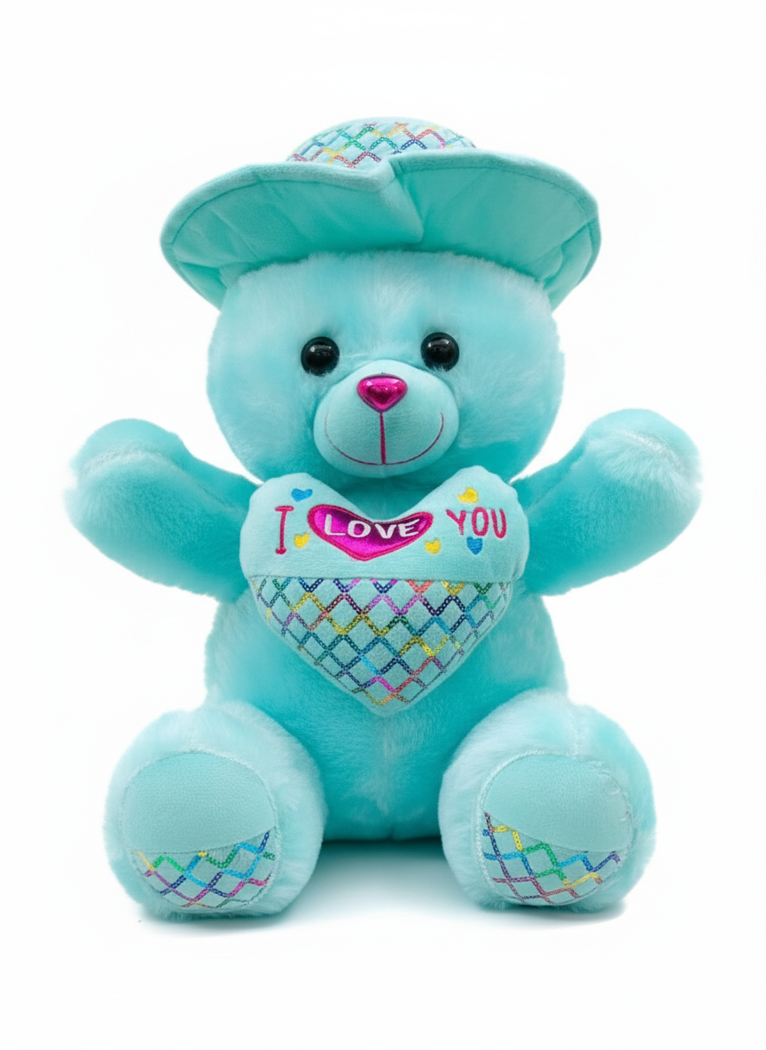 Make every hug special with this adorable Blue “I Love You” Teddy Bear, a perfect way to express love and care. Crafted from ultra-soft plush fabric, this cuddly teddy features a cute matching hat and a colorful embroidered heart that says “I Love You.” Its charming blue color and shiny pink nose make it a delightful gift for all ages.